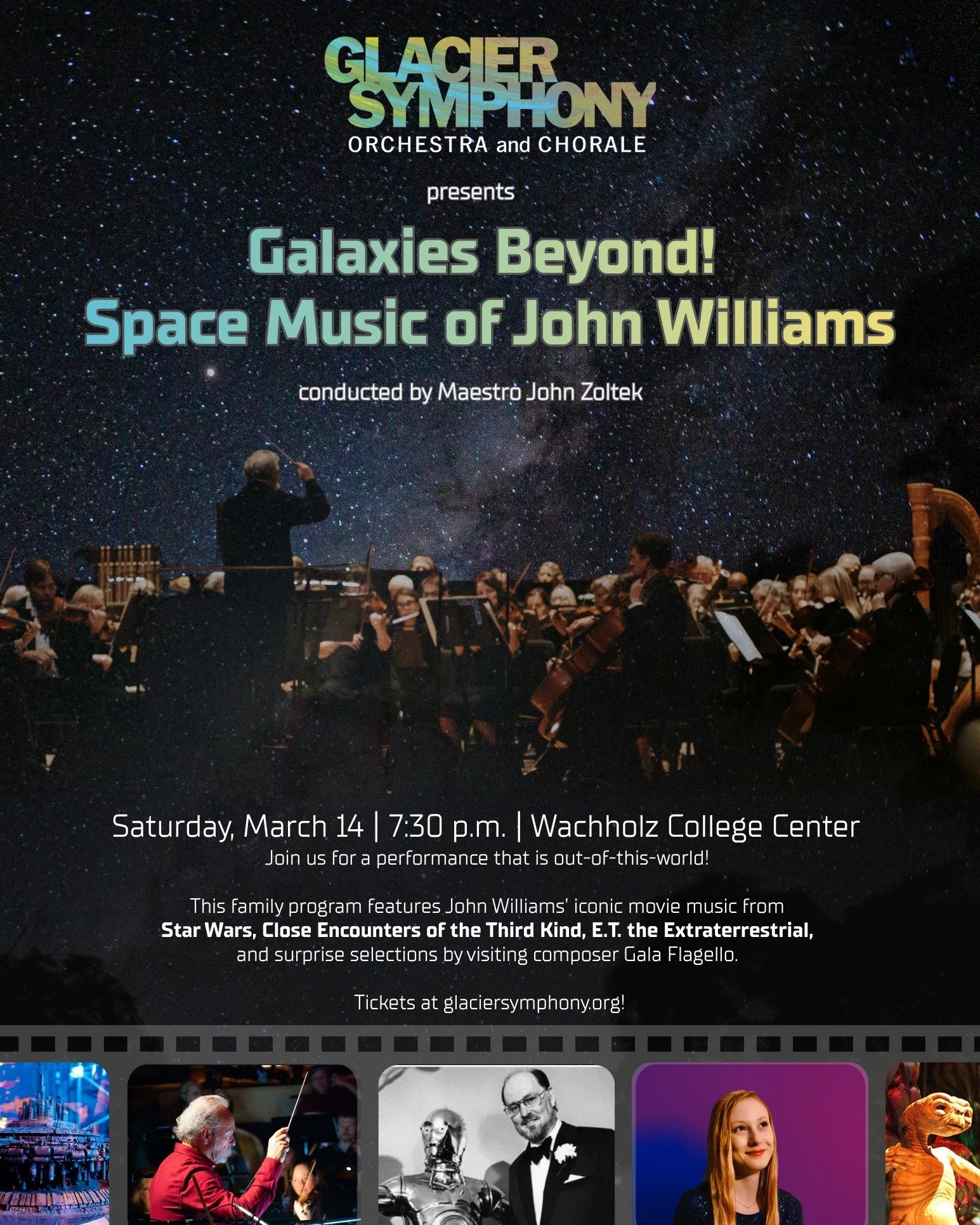 Join us for this family program featuring John Williamsβ iconic movie music from Star Wars, Close Encounters of the Third Kind, and E.T. the Extraterrestrial. We also welcome guest composer Gala Flagello for performances of her two energetic orchestral pieces, Bravado and Vitality, which are both rich in imagery and cinematic narrative.